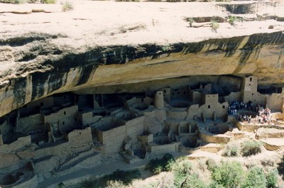 Da ist Mesa Verda schon etwas ganz anderes. Mesa Verde (grüner Tisch) hat nichts mit großen Felskolossen, Felsbrücken oder Bögen zu tun, sondern ist ein National Park, der den früheren Einwohnern unter den Felsen in Steinhäusern gewidmet ist. Vor etwa 1400 Jahren „bezog“ eine Gruppe Indianer die riesigen Aushöhlungen unter den Felsüberhängen von Mesa Verde, baute hier Steinhäuser und lebte ca. 700 Jahre dort. Im späten 13. Jahrhundert verließen sie in einer oder zwei Generationen ihre Häuser und zogen fort. Archäologen nannten sie Anasazi, nach einem Navajo Wort das die „Vormaligen“ bedeutet. Die Anasazi waren Steinzeitmenschen, die keinerlei Metall verwendeten, sondern geschickt Steine, Knochen und Holz in Werkzeuge zum Schleifen und Schneiden schufen. Über ihnen, auf dem Mesa Verde, pflanzten sie Getreide an und gingen zur Jagd.