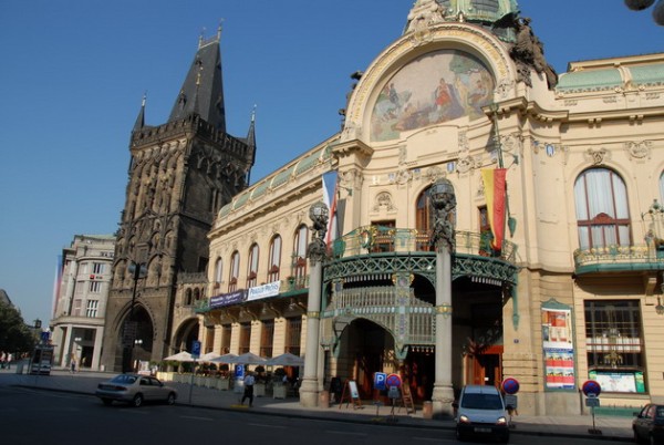 Kurz nach Ankunft marschieren wir los, um uns noch ein wenig in der näheren Umgebung umzusehen. Direkt neben unserem Hotel liegt das auch sehr schön renovierte Hotel Paris und wenige hundert Meter weiter erhebt sich der 1475 errichtete Pulverturm. Er diente wohl in erster Linie zu Repräsentationszwecken, obwohl sicher auch mal Pulver gelagert wurde. Geht man durch seinen Torbogen hindurch, so meint man seinem Blick nicht zutrauen, denn links hinter dem Turm steht das Gemeindehaus. Gemeindehäuser sehen in aller Regel sicher nicht so aus, aber es war ja auch ursprünglich mal bis zum Ende des 15 Jahrhunderts die Residenz der Böhmischen Herrscher, also der Königshof. Ein sehr schönes sehenswertes Gebäude, in dem sich unten links ein einfaches Restaurant befindet und rechts ein französisches Edelrestaurant.